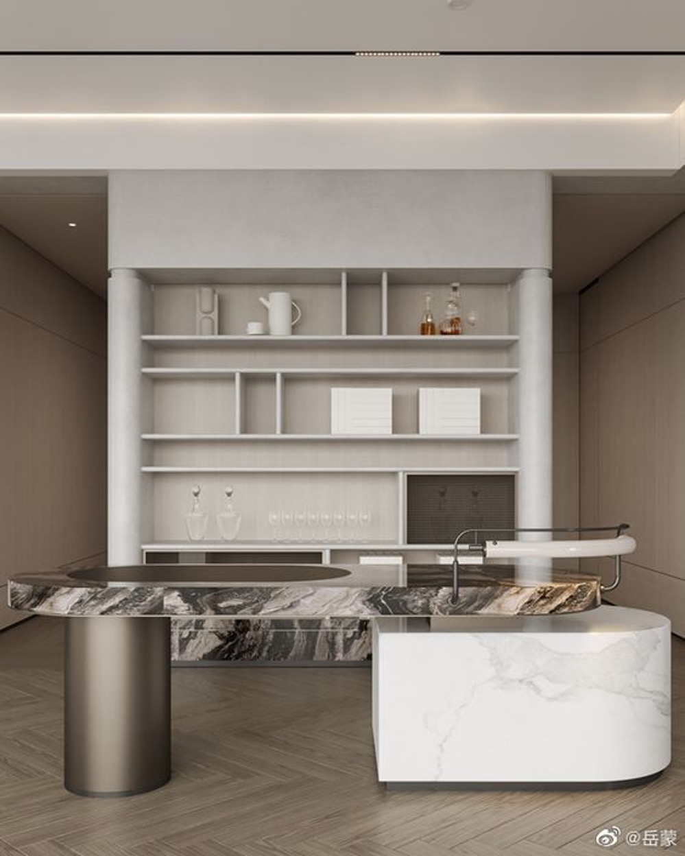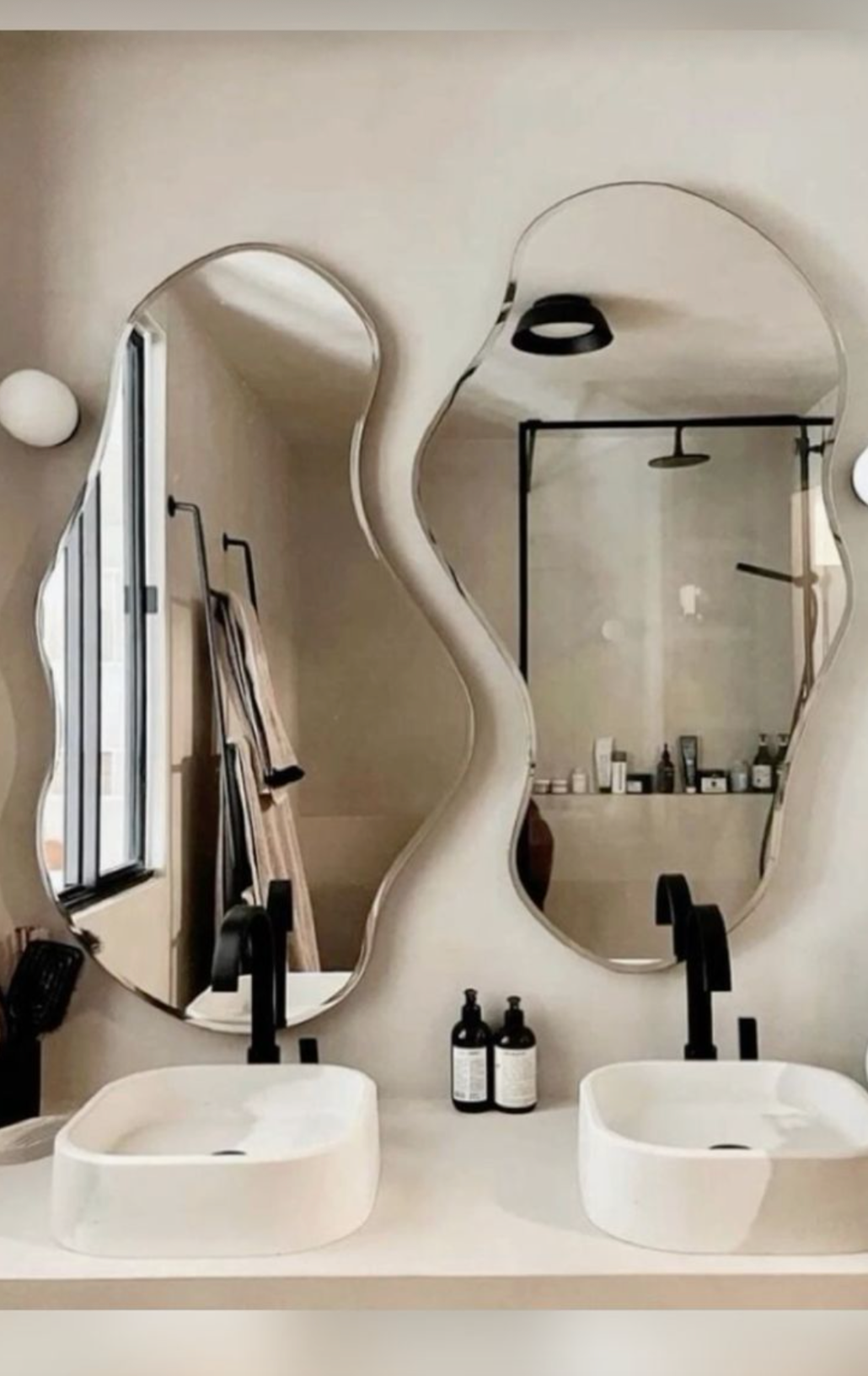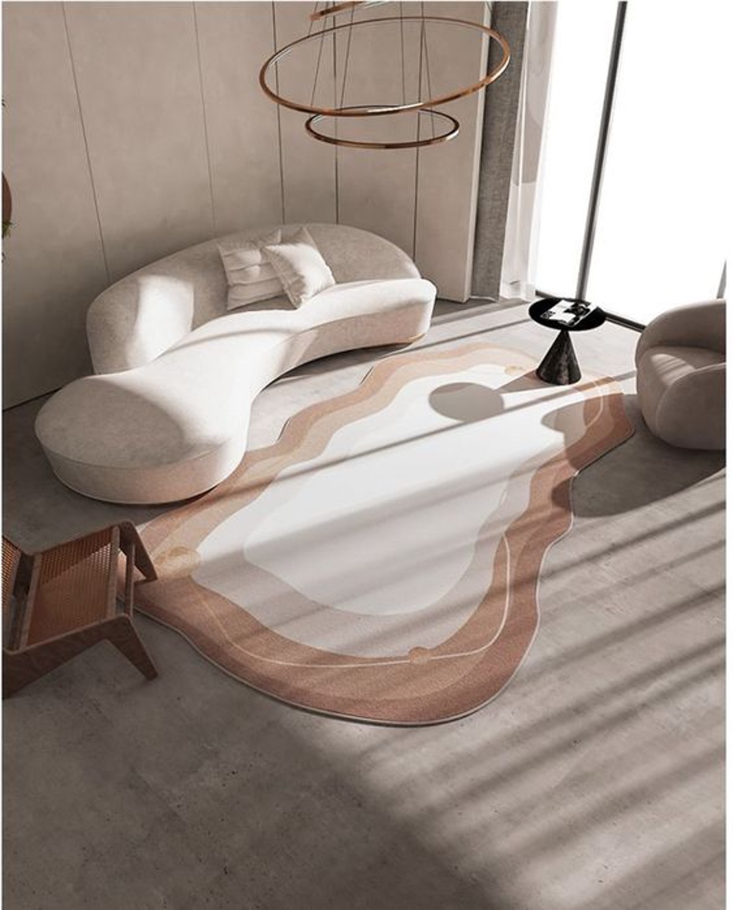 Irregular rugs, curved ceiling, mirrors, organic shelvings