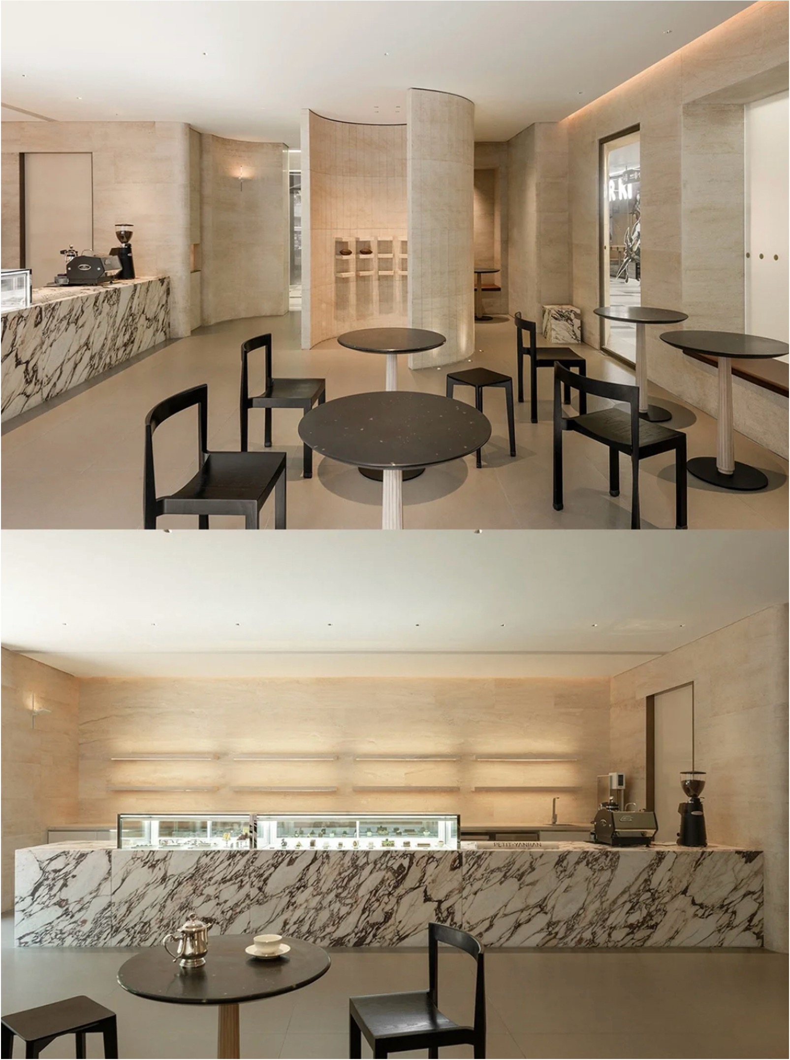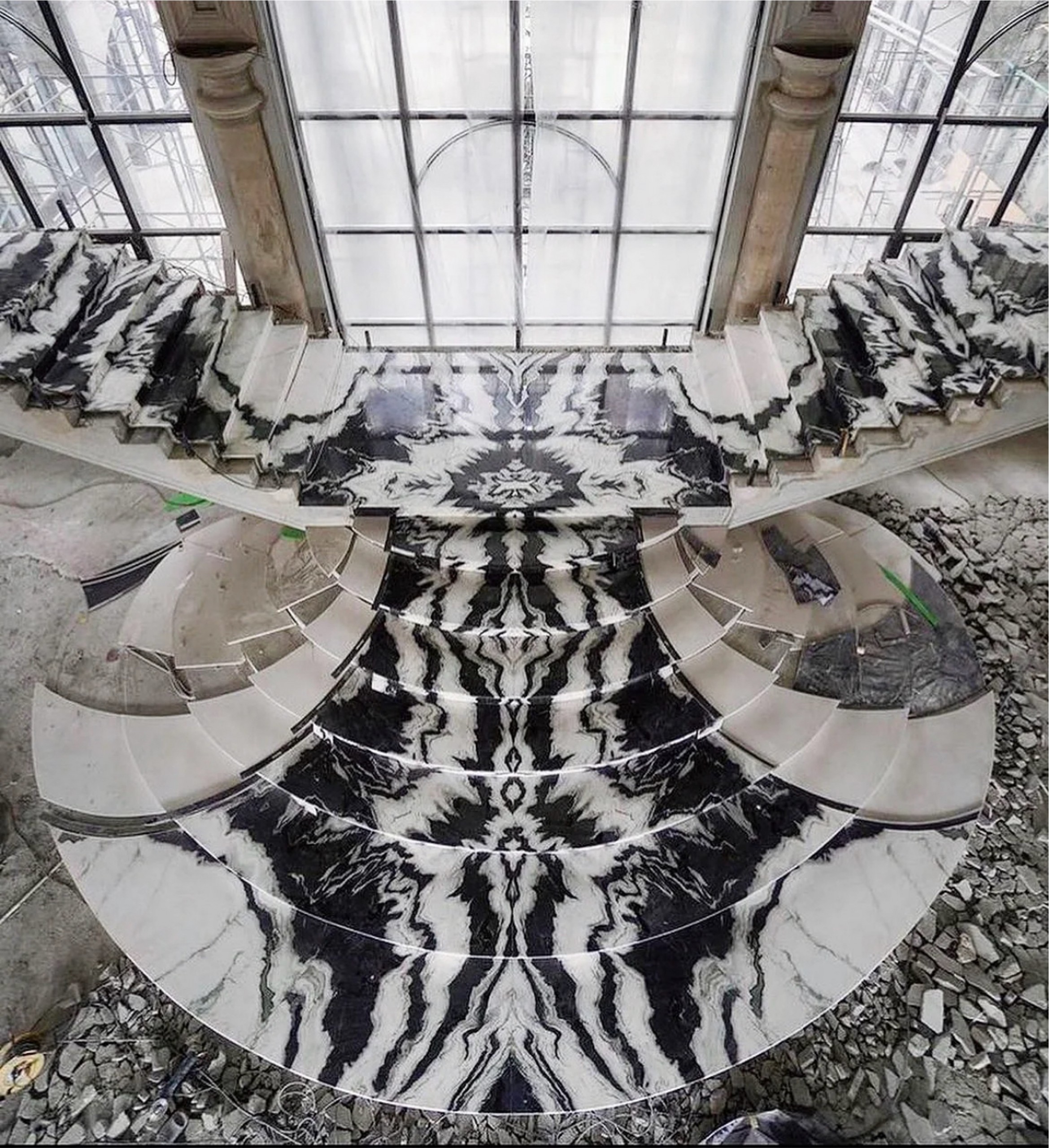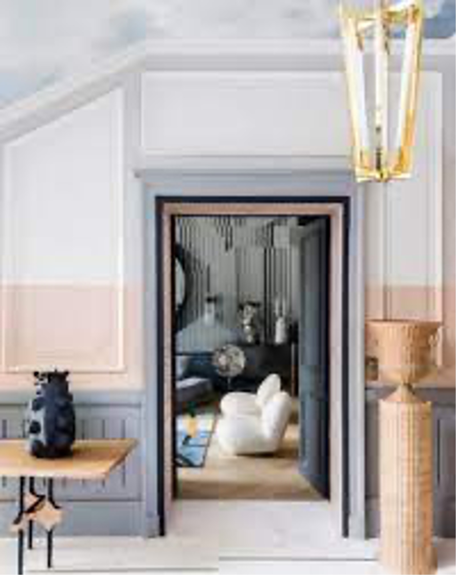 Irregular rugs, curved ceiling, mirrors, organic shelvings